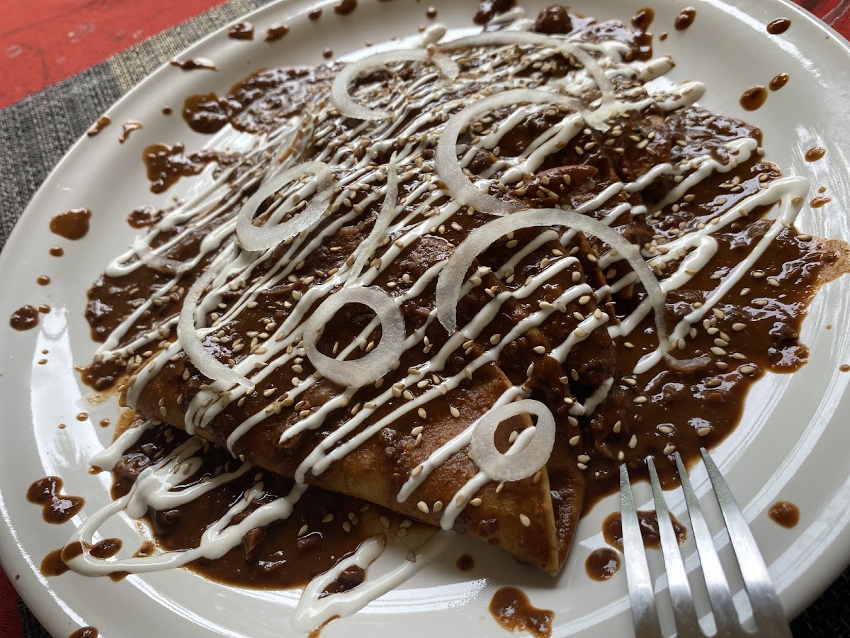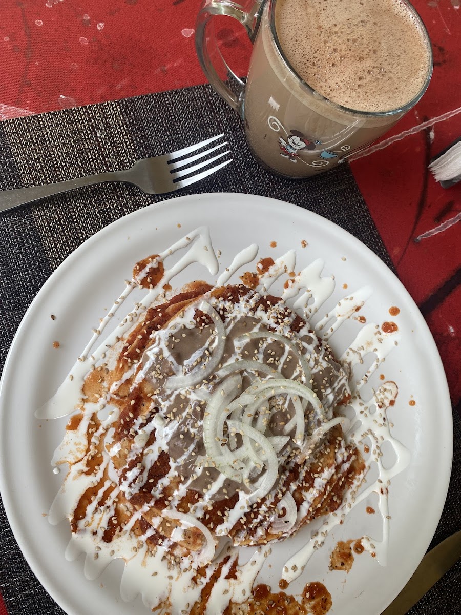 The menu offers a variety of options suitable for breakfast, lunch, and dinner, available throughout the day. It includes traditional Mexican dishes such as Tamalitos de Mole, Enchiladas, Entomatadas, Enfrijoladas, and a signature Chapata Mandalita with ham. These items are complemented by a selection of beverages featuring espresso-based coffee drinks and other café specialties.